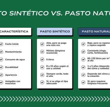 Aunque el pasto sintético tiene un costo inicial más alto, la inversión se recupera en 2 a 3 años gracias al ahorro en: